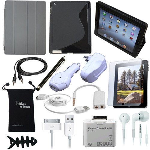 Includes: DigitalsOnDemand Black TPU Skin Case, Grey Smart Cover(Generic, Not Apple Brand), Premium DigitalsOnDemand Leather Folio Case, Screen Protector, 5 in 1 Camera Connection Kit, Earphones, Earphone Splitter, AUX Cable, Wall Charger Adapter, Car Charger Adapter, USB Sync Cable, Retractable USB Data Cable, Fishbone , DigitalsOnDemand Drawstring Travel Pouch, Black Stylus Pen